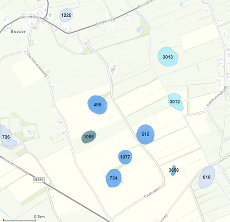Tijdens de Summerschool in 2017 onderzochten we een locatie in het dal van het Eelderdiepje, de Eekhoorns genoemd. Deze ronde laagte ligt in het verlengde van de bekende ‘3 op een rij’ pingoruïnes die door Wim de Gans (1982) zijn onderzocht en beschreven, met resp. nummer 734, 1077 en 515. Op het AHN leek deze locatie een mogelijke 4e locatie te zijn in deze bekende ‘rij’. We hebben hier een raai geboord, maar kwamen tot een heel andere conclusie!