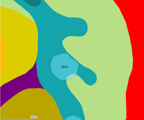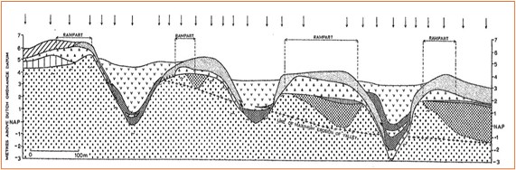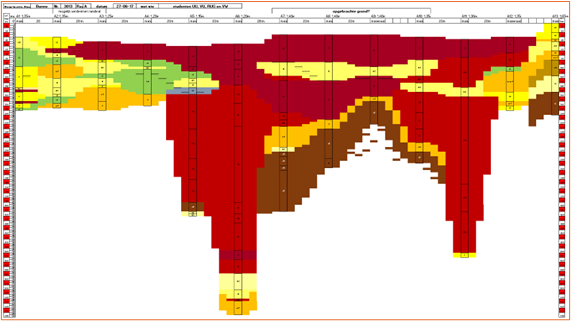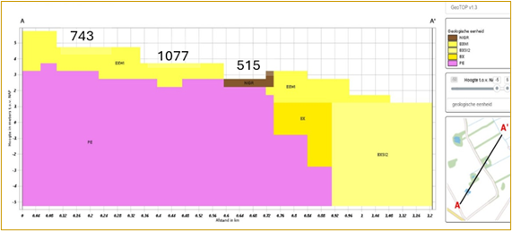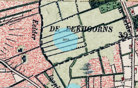 Ook op de kaart van 1915 zie je de contouren van het beekdal, evenals op de geomorfologische kaart. Het gaat hierbij om een beekdal zonder veen, maar zoals we hebben geconstateerd bij de boringen is er wel veen aanwezig in het bovenste deel, en heel veel gyttja in de diepe geulen! Dit betekent dat ze gedurende lange tijd openwater hebben gehad. In de boorbeschrijvingen wordt ook, aangegeven dat er dunne, ingewaaide zandlaagjes aanwezig zijn en plantenresten.