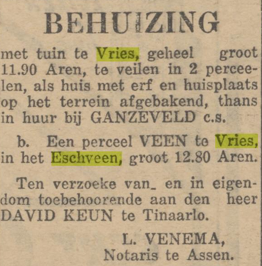 In het noordwestelijke deel van Vries ligt een ronde vijver, met de naam Esch veen. Veen kun je er nu –bijna- niet meer vinden, maar als je naar de kaart uit 1915 kijkt, zie je dat het een ronde laagte is, met meerdere veenputten. In opdracht van de gemeente Tynaarlo is deze locatie onderzocht met een groep van 6 vrijwilligers.