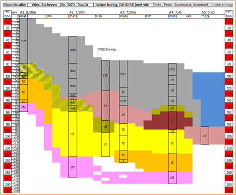 Vanaf de rand van het gazon, bij het fietspad tot aan de rand van het water zijn 4 boringen op een rij gezet. Ook is de guts zo diep mogelijk in het water gestoken, om te zien of de vijver een veenbodem heeft. De boringen zijn uitgewerkt tot een profiel. Hieruit valt te concluderen, in combinatie met de kaart gegevens, dat het zeer waarschijnlijk een pingoruïne betreft.