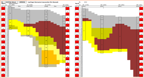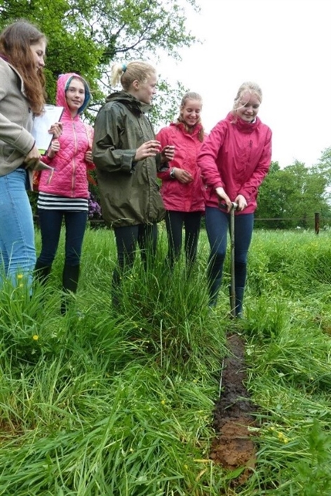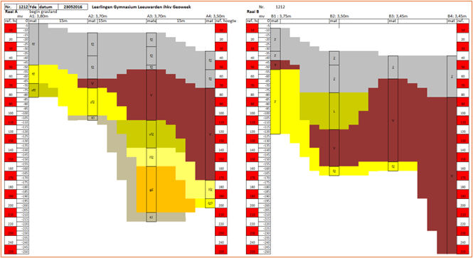In 3 groepjes van 5 leerlingen en een docent of begeleider is gewerkt langs twee lijnen of raaien, A en B, waarbij om de 15 meter een boring is gedaan en beschreven. De leerlingen hebben, ondanks het slechte weer, hard gewerkt en hun werk heeft geleid tot mooie resultaten!