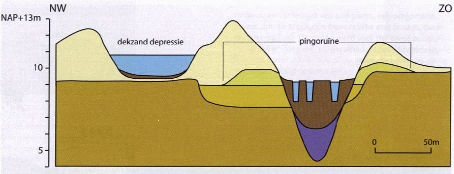 Het verschil tussen een pingoruïne en een uitblazingskom wordt uitgelegd bij de algemene tekst. In het figuur hieronder wordt het verschil getoond.