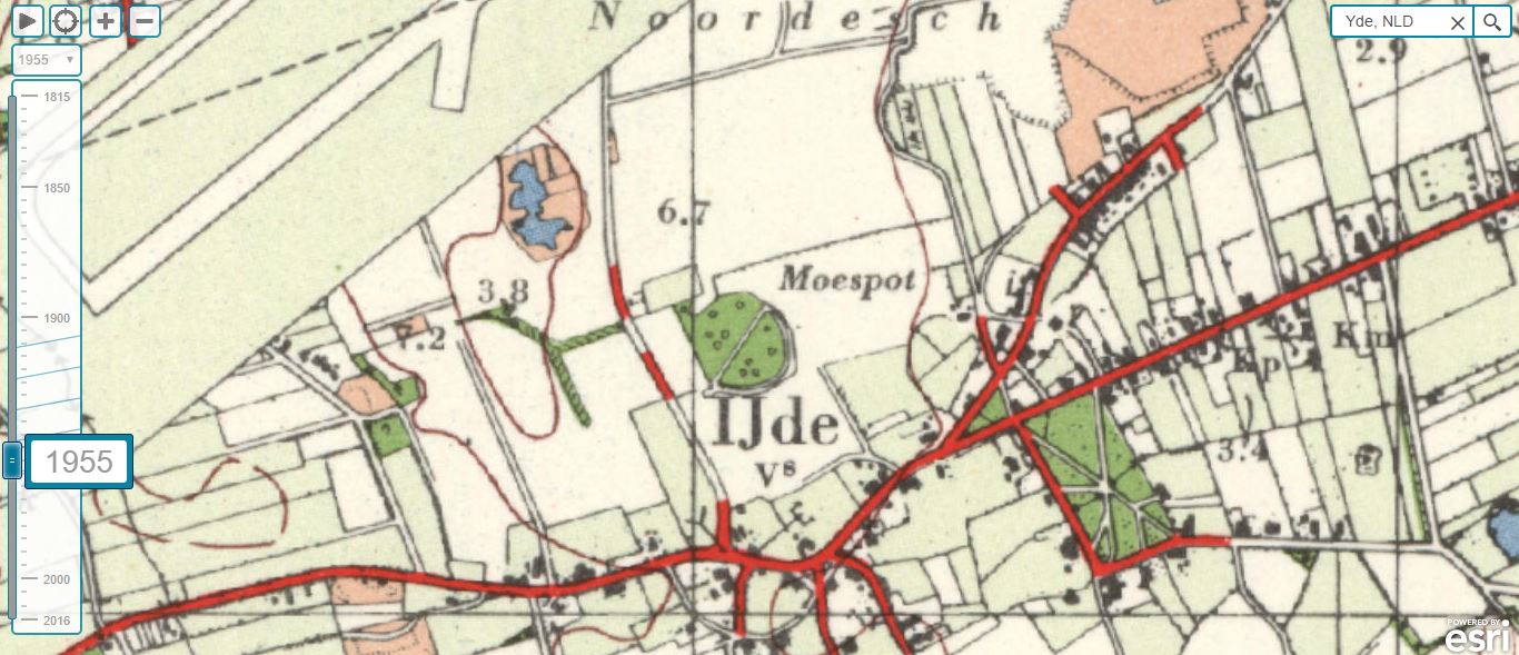 Op de kaart met historisch landgebruik uit 1832 is De Moespot zichtbaar als een ‘roze plek’ in het landschap; dit betekent dat het als heide of veentje midden in de akkers lag (licht geel).