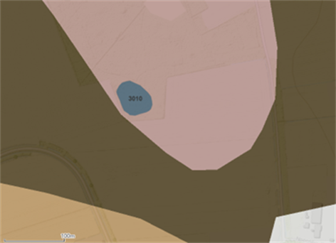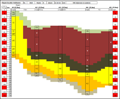 De ondergrond bestaat hier uit keileem (grijs in het profiel) en het heeft een vrij vlakke bodem. Op het keileem ligt bij alle boringen keizand (oranje), dit is verweerde keileem. Op het keizand ligt een dunne laag dekzand (geel). In het centrale deel kwam een gliede laag voor. Overal was de diepte minder dan 2 meter.