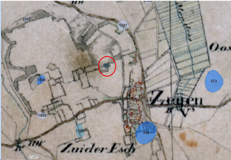 Het dekzand is weggeblazen waardoor zich een kom vormde. Door de aanwezigheid van de keileem vormde het een natte plek, waardoor er zich vervolgens open water heeft gestaan waarin zich de gliede ontwikkelde, vervolgens heeft zich een veenpakket ontwikkeld. De toplaag bestaat uit een dunne strooisel laag, gevormd door bladafval. De laagte is in totaal is niet meer dan 1,60m diep en heeft een vrij vlakke bodem (zie profiel). De locatie ligt op de grens van de esgronden (donkerbruin) en een oude bosbodem (Laarpodzol) (bruin-roze). Het bosgebied waarin hij ligt is al een oud bos, wat helemaal rondom de essen ligt (zie fragment 1850). Het is een van de vele natte laagtes rondom Zeijen.